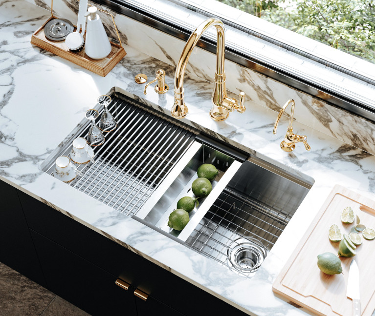 Handcrafted in Italy, our exceptional line of commercial-grade Stainless Steel Sinks are best in class and synonymous with luxury kitchens. Unparalleled craftsmanship shines through with insulating “quiet coat” technology while the uniquely patterned Tangent Edge® boasts zero-edge side walls and a rounded, easy-to-clean bottom edge. Rejecting the norm, ROHL® Luxury Stainless Steel sinks are beautiful, long-lasting and innovative solutions that continue to be the choice of discerning customers seeking only the best for their culinary spaces.