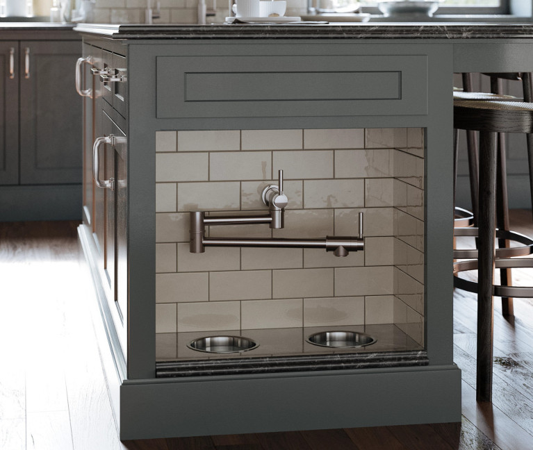 No longer is the pot filler just installed above the range to assist home chefs in their cooking pursuits — they are also being used in other areas of the kitchen and home. Some are being used in pet stations to keep pets hydrated, while others are being installed next to the espresso maker to conveniently fill this appliance. Our pot fillers are available in a variety of finishes so that the homeowner can either match their kitchen faucet or create a personalized area by mixing and matching styles and finishes.